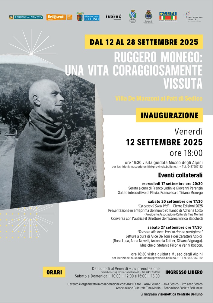 Venerdì 12 settembre 2025, presso la villa De Manzoni ai Patt di Sedico, alle ore 18:00, sarà inaugurata la mostra “Ruggero Monego: una vita