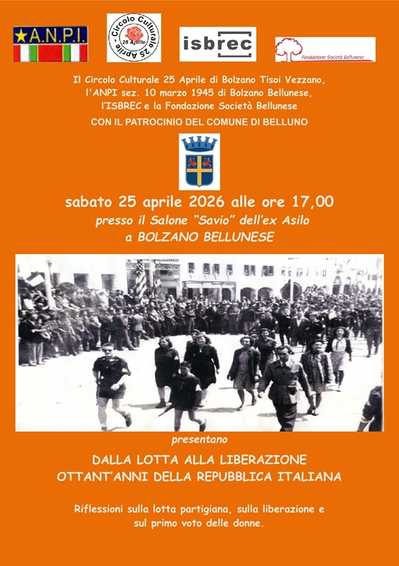 Asilo di Bolzano Bellunese, il Circolo Culturale XXV Aprile di Bolzano bellunese e Tisoi, l’ANPI, l’ISBREC con il sostegno della Fondazione Società Bellunese, e il patrocinio del Comune di Belluno, presentano la manifestazione “1945-2025 Ottant’anni di Resistenza”, la proiezione di un filmato con le testimonianze delle partigiane Vivetta De Moliner e Agnese Righes, raccolte da Zenone Sovilla. Saranno altresì proposte alcune riflessioni sulla Resistenza in tempi di Pace e di Guerra.