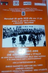– il Circolo XXV Aprile di Bolzano Bellunese Tisoi e Vezzano, L’ANPI, l’ISBREC e la Fondazione Società Bellunese, in collaborazione con il Comune di Belluno – presentano “1938-1948 I DIECI ANNI CHE SCONVOLSERO L’ITALIA, 80 anni dalla promulgazione delle leggi razziali e 70 anni dalla carta Costituzionale”. Partecipano: Enrico Bacchetti Direttore, dell’ISBREC e Lorenzo Chiesura, Presidente Consulta Provinciale degli studenti.