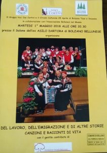 di Bolzano Bellunese, il Gruppo Voci dai Cortivi e il Circolo Culturale XXV Aprile di Bolzano Tisoi e Vezzano, in collaborazione con l’Associazione Bellunesi nel Mondo, col contributo della Fondazione Società Bellunese, organizzano la rappresentazione musicale “DEL LAVORO, DELL’IMMIGRAZIONE E DI ALTRE STORIE, CANZONI E RACCONTI DI VITA”