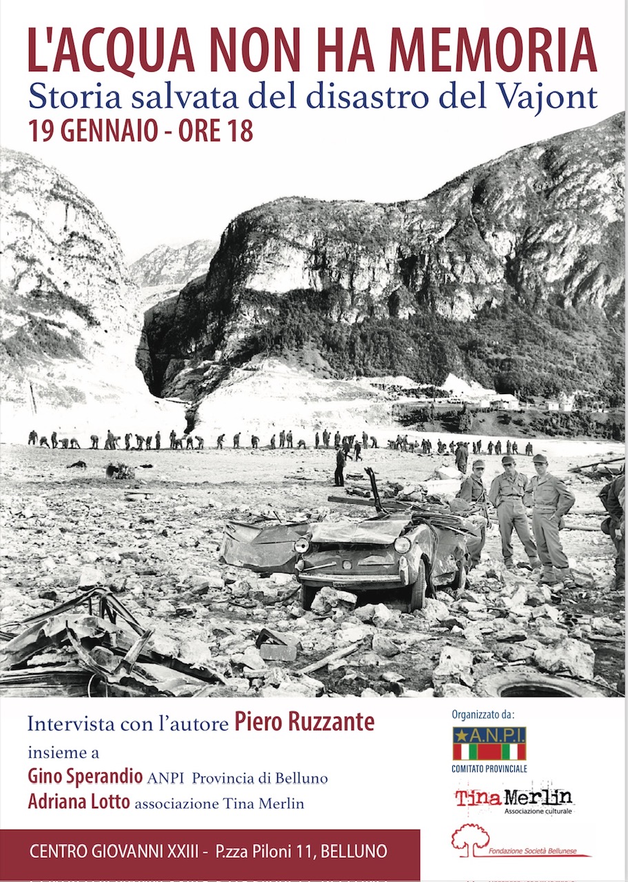 Centro Giovanni XXIII di Belluno Piazza Piloni, 11 – l’Associazione Tina Merlin, l’ANPI e la Fondazione Società Bellunese – presentano il libro di Piero Ruzzante “L’Acqua non ha memoria. Storia salvata del disastro del Vajont”.